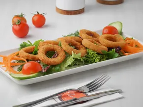Patates cips üzerinde soğan halkası, sigara böreği, spesiyal soslar ile