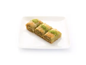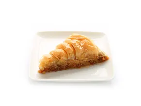 Tereyağlı nazar baklava üzeri çikolatalı enfes sos ve rende çikolata parçaları