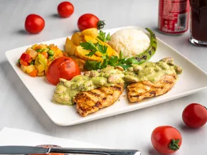 Izgara edilmiş tavuk külbastı, acılı meksikan sos, kaşar peyniri, pilav, patates cips, karışık sebze garnitür