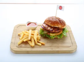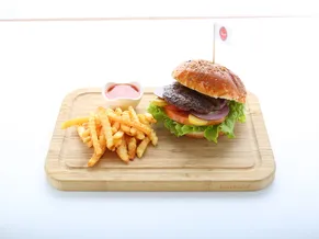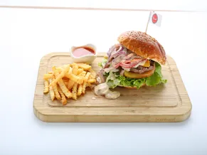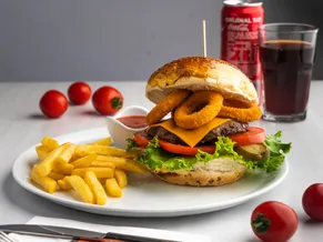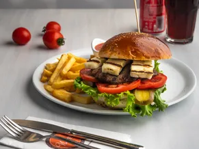İki kat el yapımı köfte, marul, domates, kornişon, cheddar peyniri, rus ezmesi, isteğe göre kırmızı soğan, cips ve sos eşliğinde