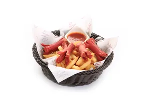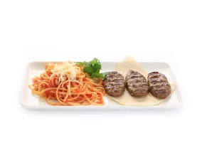 Panelenmiş tavuk parçaları, spagetti, patates cips