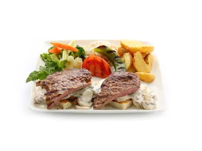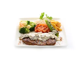 Izgara dana bonfile, kremalı mantar sos, pilav, patates cips, karışık sebze garnitür, ızgara domates, biber
