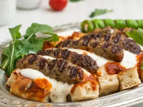 Izgara köfte, tereyağlı pide ekmeği, tava yoğurt, tereyağlı domates sos, köz domates ve biber