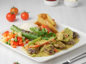 Izgara köfte, kremalı mantar sos, pilav, patates cips, karışık sebze garnitür
