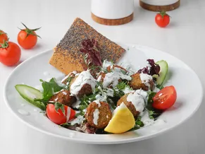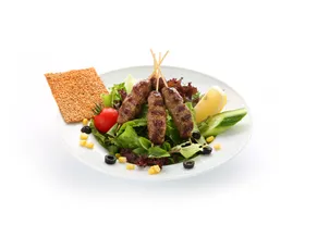 Izgara köfte, karışık mevsim yeşillikleri, çeri domates, salatalık, mısır