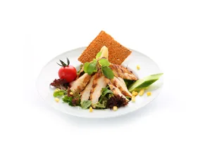 Izgara tavuk göğüs, karışık mevsim yeşillikleri, çeri domates, salatalık, mısır