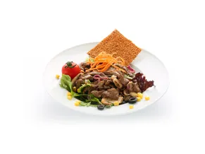 Sotelenmiş dana bonfile parçaları ve soğan, karışık mevsim yeşillikleri, çeri domates, salatalık, mısır