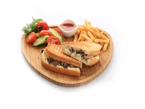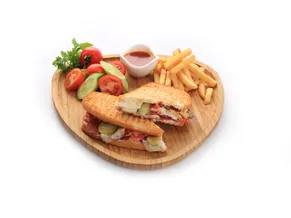 Sucuk, salam, kaşar peyniri, turşu, ketçap, mayonez, cips ve sos eşliğinde